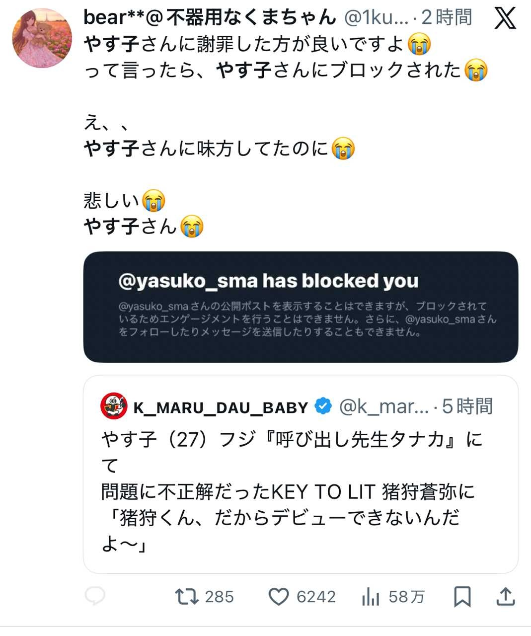 - 謝った方が良いんじゃないですか?と心配するファンをブロックするやす子