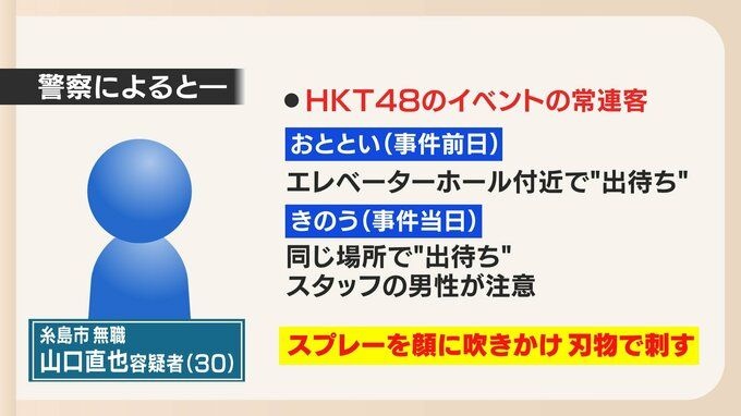 【福岡市男女2人殺傷事件】容疑者の男(30)が事件前日に”出待ち”か HKT48のイベント常連客 | TBS NEWS DIG (2ページ)14日、福岡市で男女2人が刃物で刺された事件で、逮捕された30歳の男がHKT48のイベントの常連客であることが分かりました。 (2ページ)newsdig.tbs.co.jp - 3 : 2025/12/15(月) 19:35:22.53 ID:BEddWxS+0