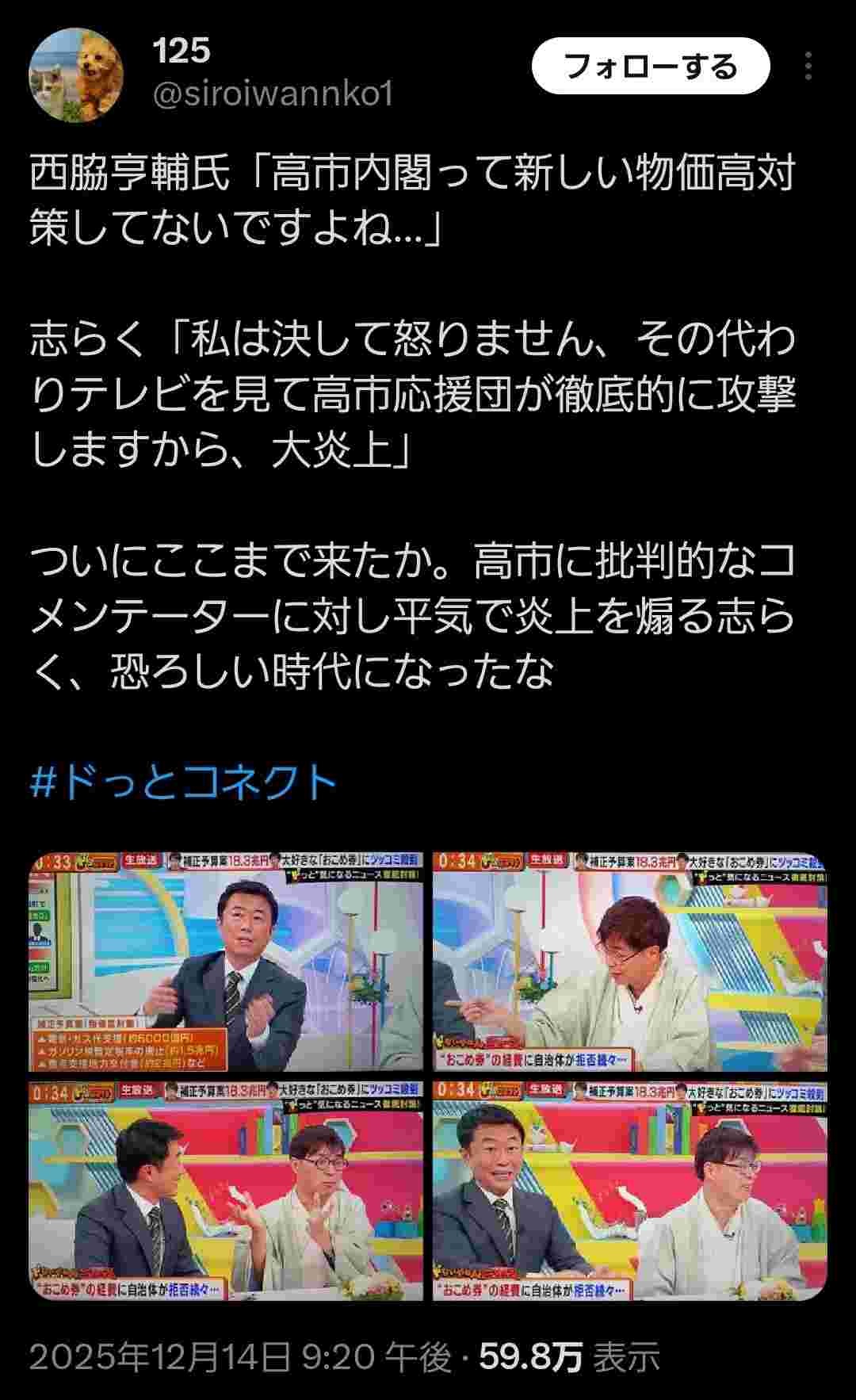 解説者「高市、物価高対策何もしてなくね?」志らく「…俺は怒らないけどネットの高市応援団が黙ってないよ?www