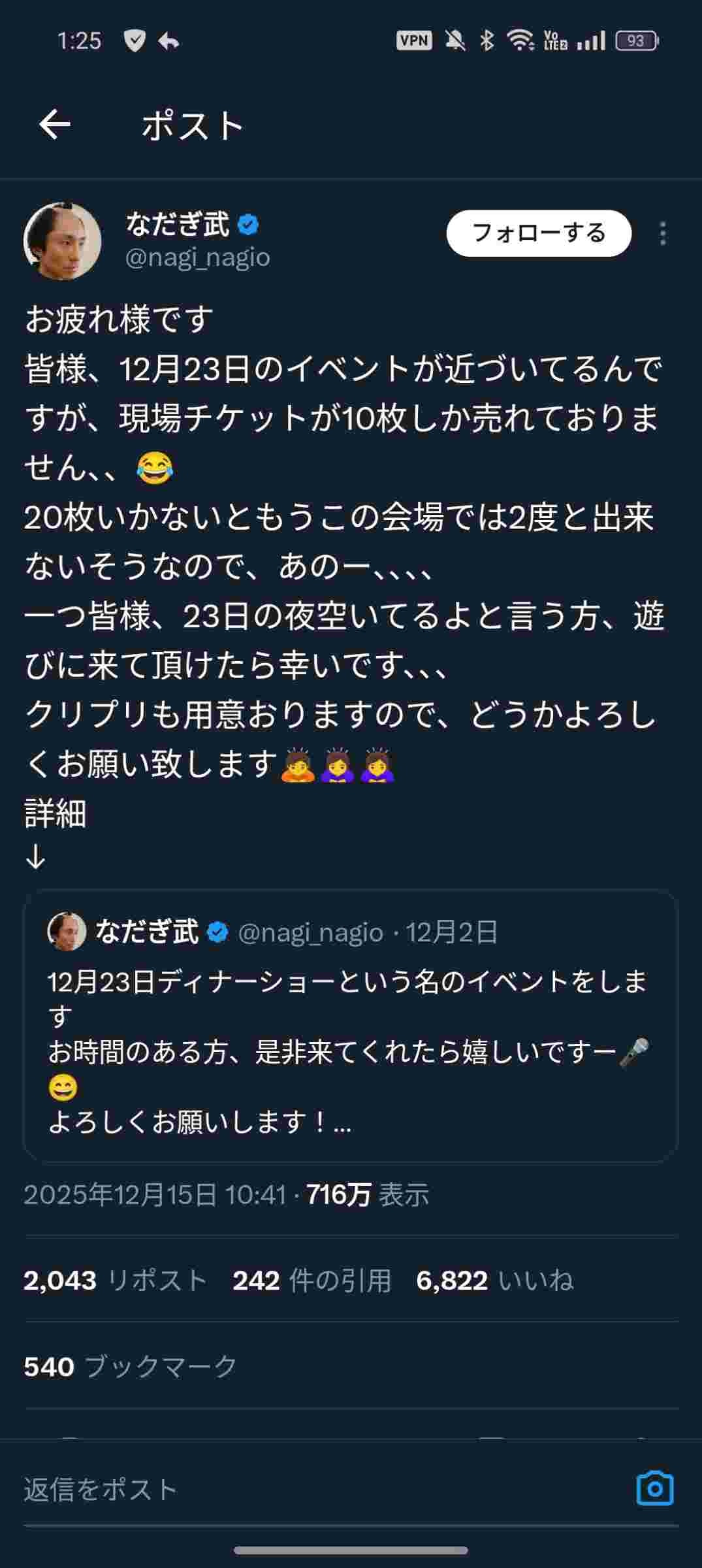 なだぎ武、クリスマスディナーショーの予約を満杯にする エッヂ民敗北へ