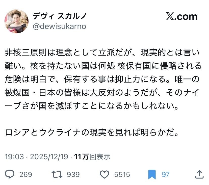【愛国】デヴィ夫人「被爆国・日本の皆様は核兵器保有に反対のようだが、そのナイーブさのせいで国が滅びる事になる」