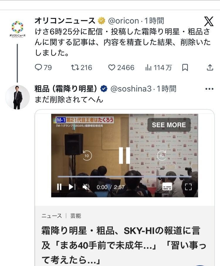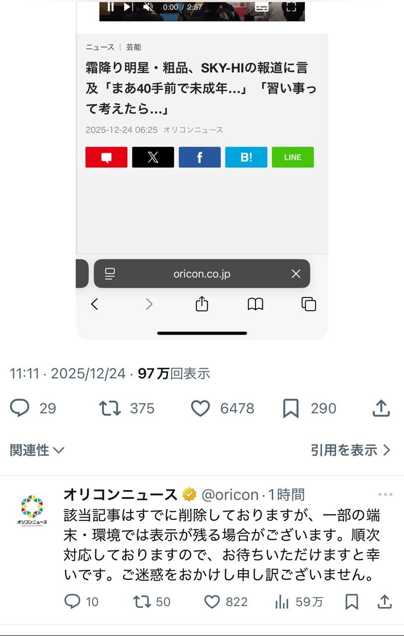 偏向じゃないならチキったのは謝罪して記事削除したオリコンの方ちゃうの? - 86 : 2025/12/24(水) 14:13:09.463 ID:URO1GY48Q