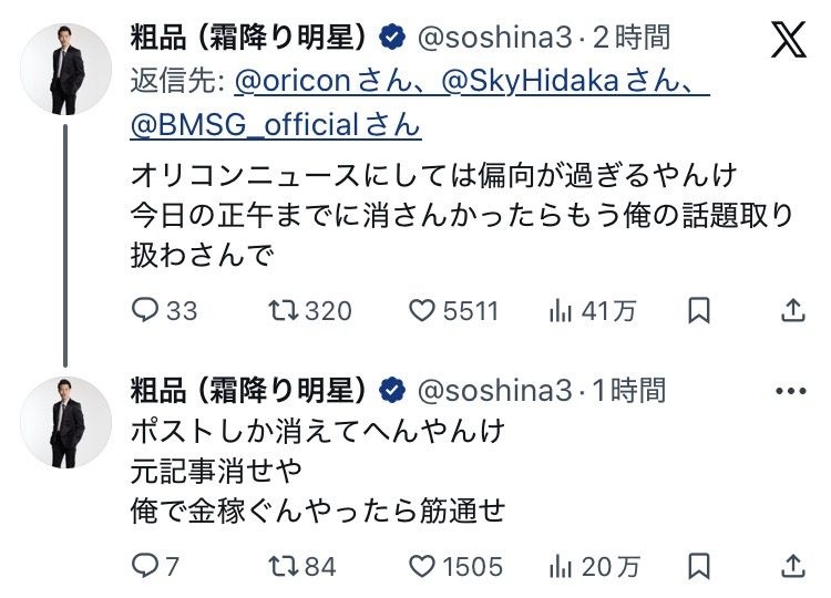 粗品「おいオリコンゴラァ!偏向報道すんじゃねえ!!!」オリコン「ヒッヒェ~すみません😭すぐ記事消しますから😭」