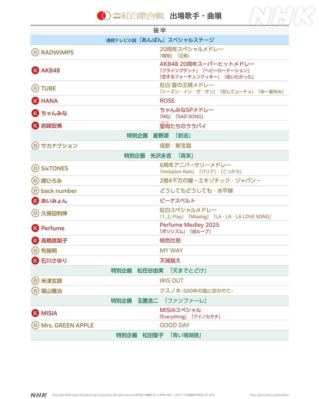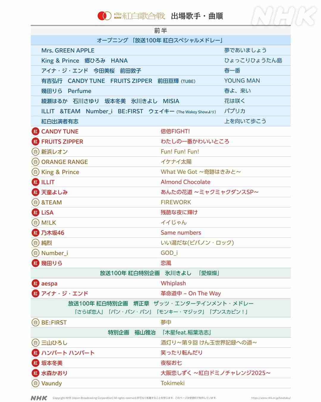 紅白、曲順更新www