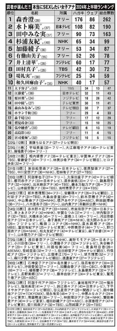 安住アナは何位よ?
