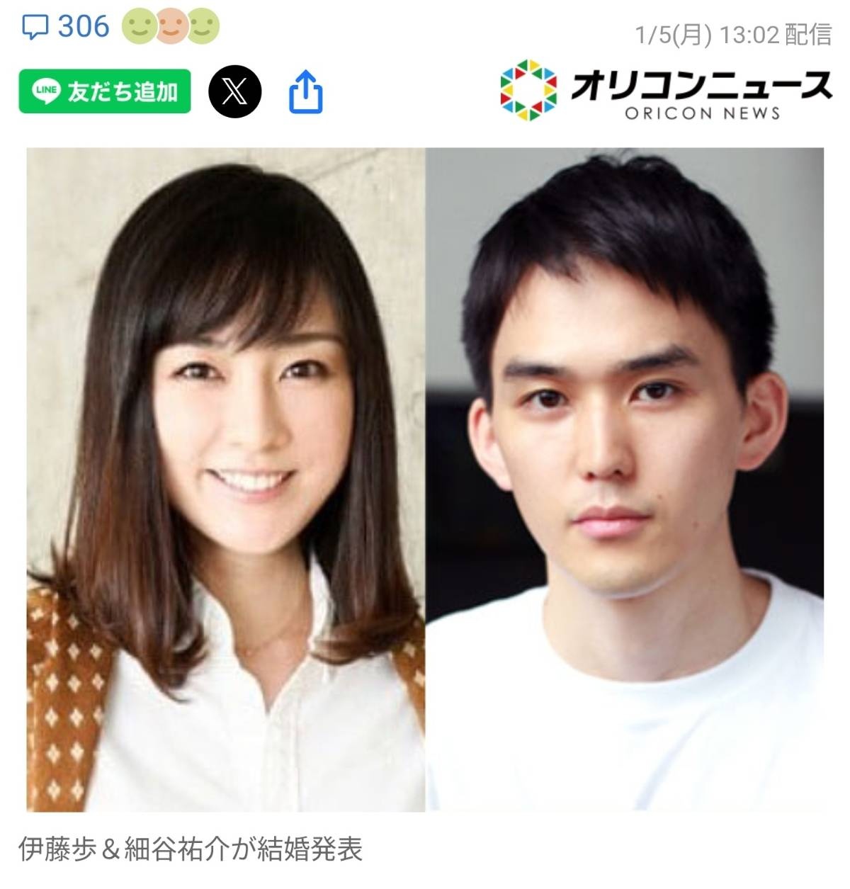 - 俳優の伊藤歩(45)と俳優の細谷祐介(31)が5日、それぞれのインスタグラムを通じて結婚を発表した。