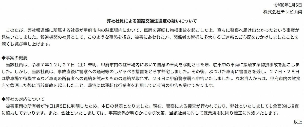 公式サイトでは「弊社報道部に所属する社員が甲府市内の駐車場内において、車両を運転し物損事故を起こした上、直ちに警察へ届け出なかったという事案が発生いたしました」と発表。「報道機関の社員として、このような事態を招き、被害にあわれた方、関係者の皆様に多大なるご迷惑とご心配をおかけしましたことを深くお詫び申し上げます」と謝罪した。