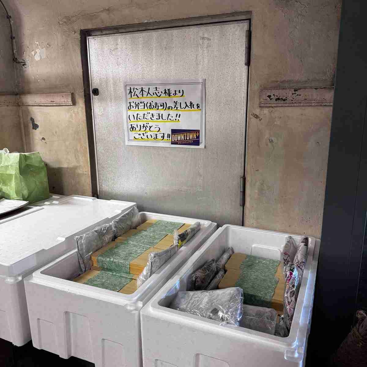 大量のお弁当が入っている箱がずらりと並んでいる。張り紙には「松本人志様よりお弁当(お寿司)の差し入れをいただきました!!ありがとうございます!!」と書かれている。