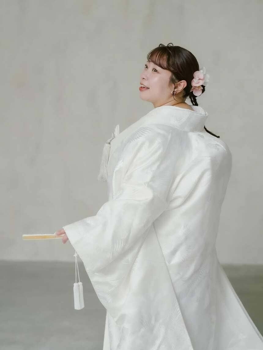 餅田さんは、純白の打掛とドレスでインスタグラムに4ポーズを投稿。