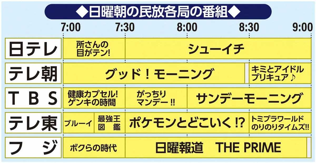同枠は現在、各局が情報番組でしのぎを削っている。11日放送の平均世帯視聴率はTBS「サンデーモーニング」が11・9%(関東地区、ビデオリサーチ調べ)でトップ。日本テレビ「シューイチ」の10・0%、テレビ朝日「グッド!モーニング」の7・0%と続く。