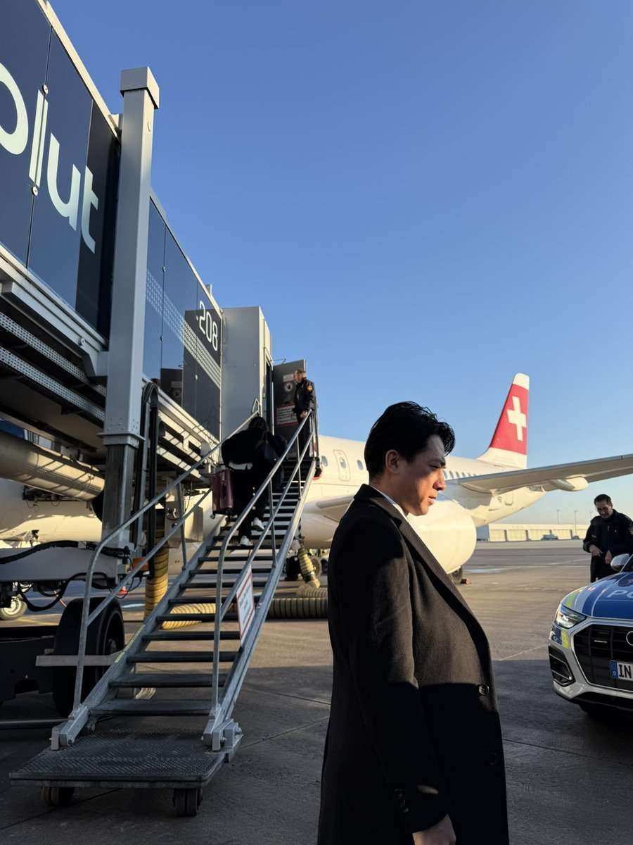 としてスイス行きを報告。飛行機を背景に、黒いコートを着てたたずむ様子を披露した。日光に照らされ、目には影が落ちてドラマチックな雰囲気を醸している。
