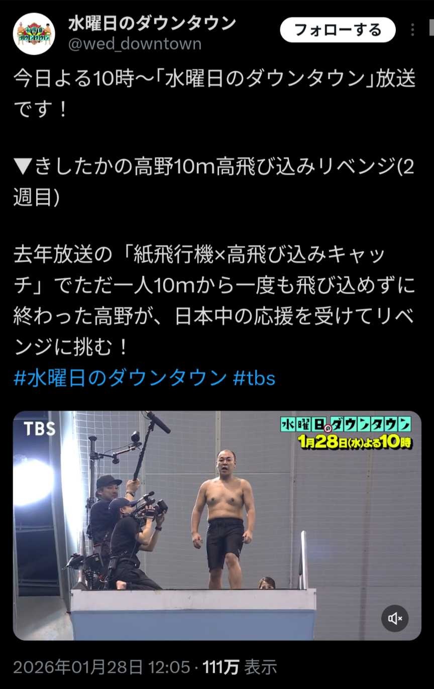 水曜日のダウンタウン、高野の飛び込みチャレンジ2週目突入www