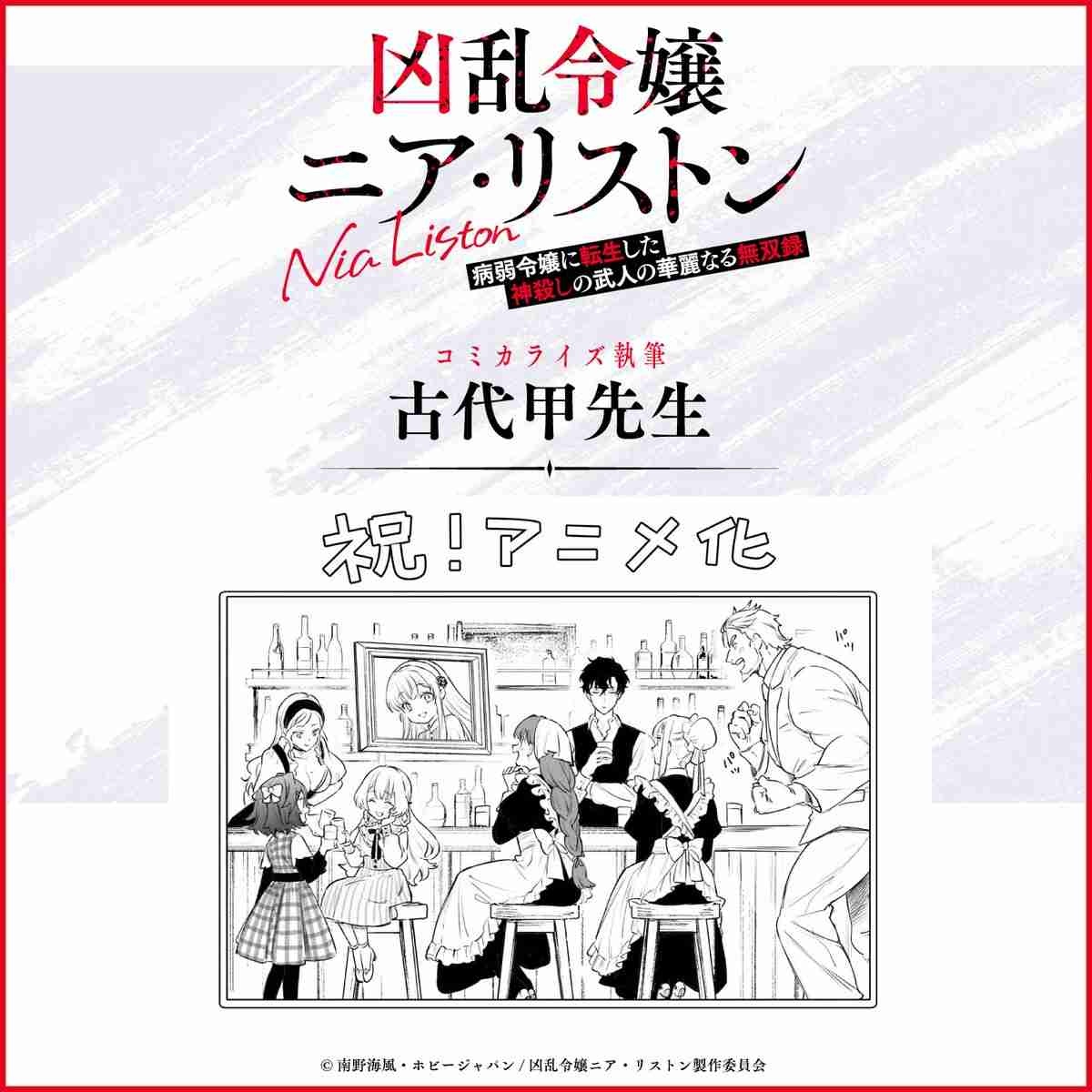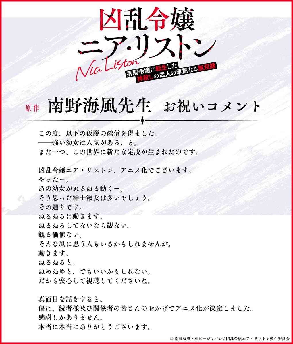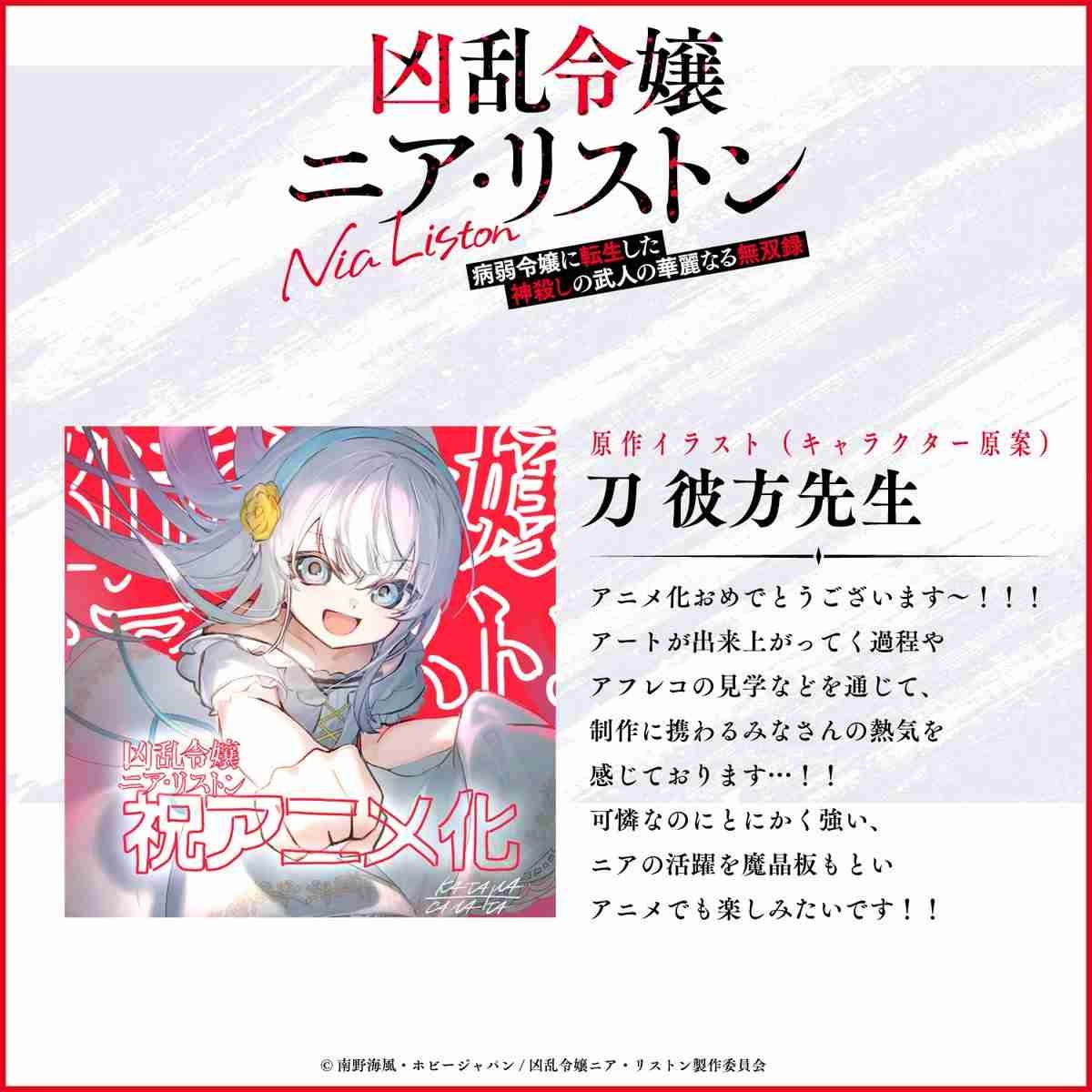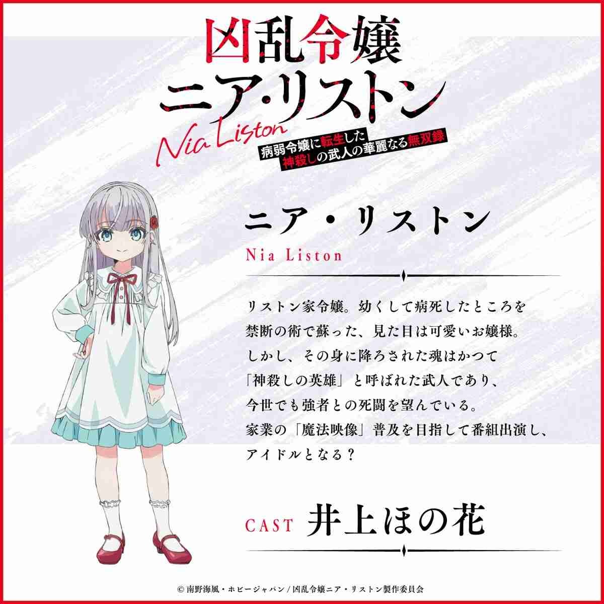 小説投稿サイト「小説家になろう」などで人気の南野海風さんのライトノベル「凶乱令嬢ニア・リストン 病弱令嬢に転生した神殺しの武人の華麗なる無双録」がテレビアニメ化され、10月から放送されることが分かった。かつて神殺しをも成し遂げた大英雄が病弱な貴族令嬢へ転生する……というストーリーで、井上ほの花さんがリストン家の令嬢・ニア・リストンを演じることも発表された。