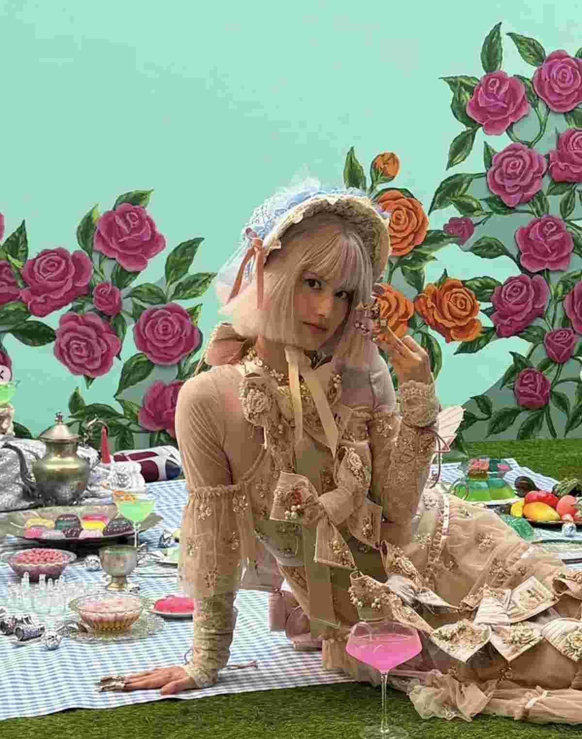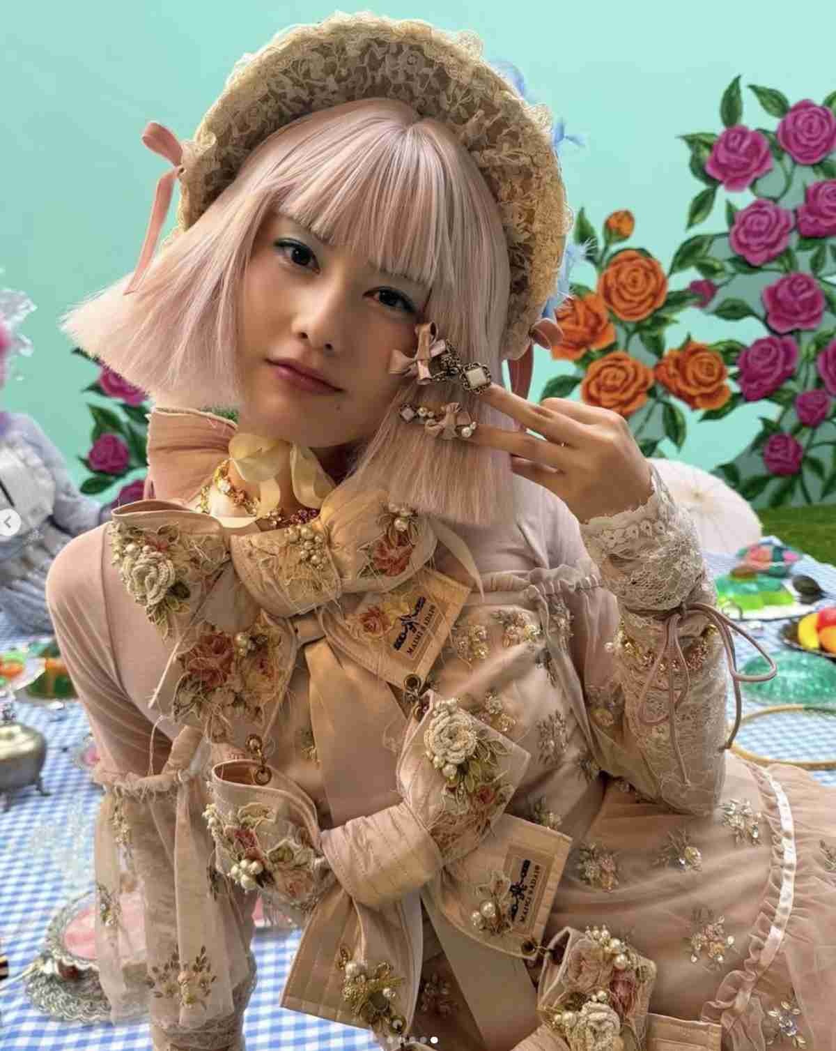 ピンクブロンドのボブヘアスタイルを見せる橋本さんは、フリルやリボンのついた同系色のドレスを着用。華やかなヘッドドレスや傘の小物を用いたちょっぴりクラシカルな装いで、橋本さんの柔らかくも凛とした表情が目をひく一枚です。