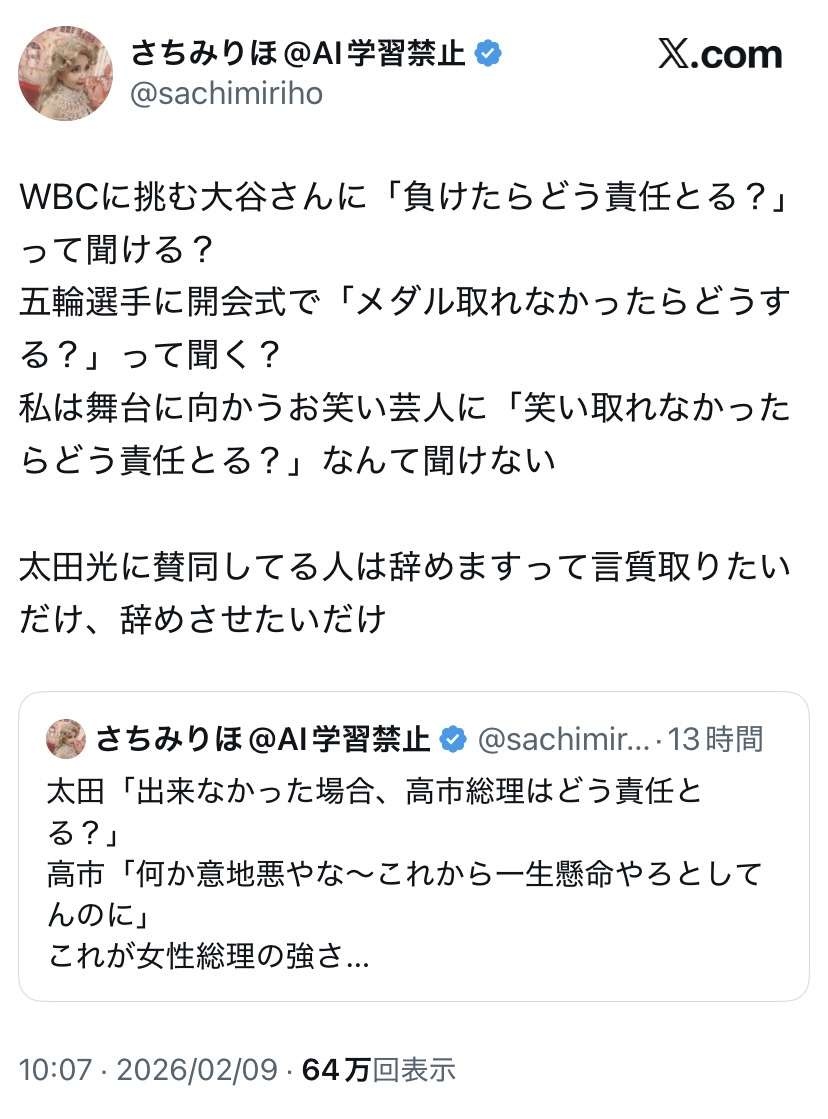 X(旧ツイッター)では「なんでこんな質問しか出来ないのか?」「この質問いる? 失敗前提でやるやつがいるかよ」といった声の一方、「減税できなかった時の質問は当たり前でしょ」「太田光も好きではないんだが、高市が食料品の消費減税を掲げた以上その質問は妥当」「双方の立ち場が分かるだけに どちらも悪くないとは思う」などの声も上がった。