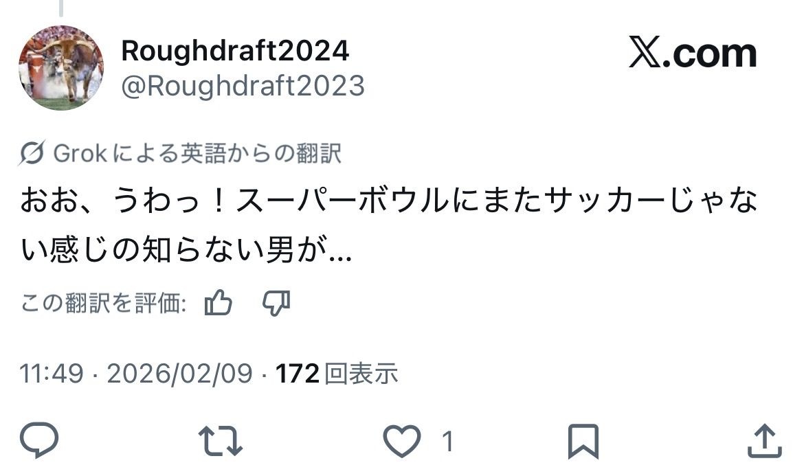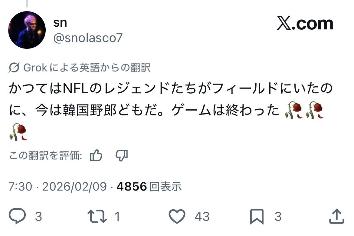 スーパーボウルによくわからんチョンでしゃばってきて嫌われてて草って意見だけど? - 5 : 2026/02/10(火) 16:40:29.787 ID:us/BfGCuT