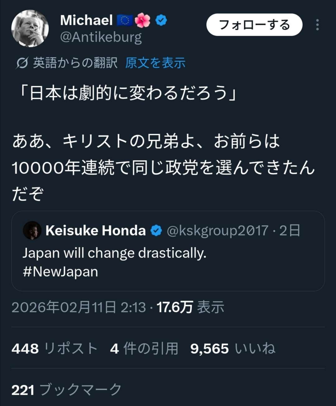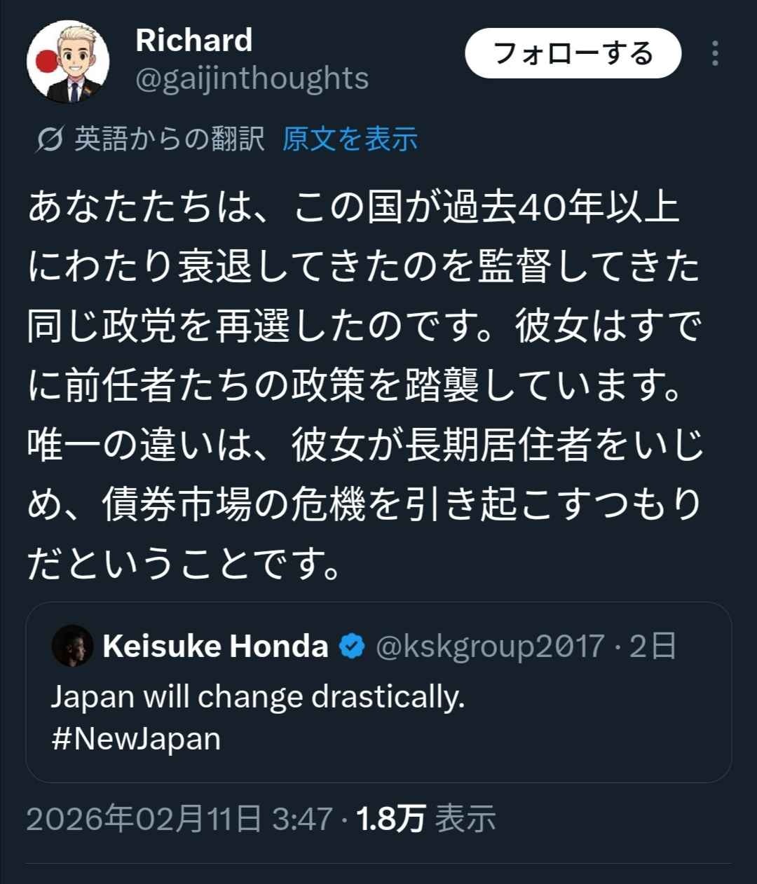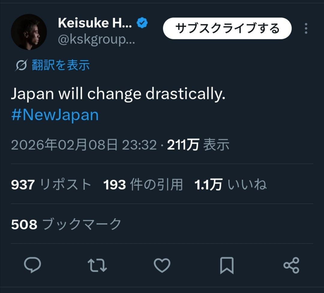 本田圭佑、高市政権を称賛「Japan will change drastically」→外国人「ずっと同じ政党を選んでるのに(笑)」