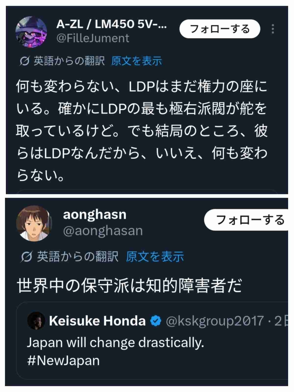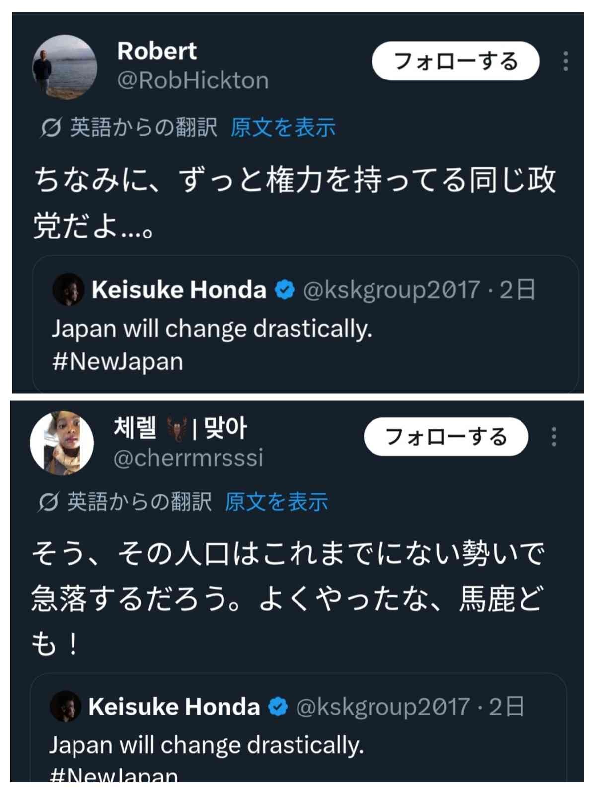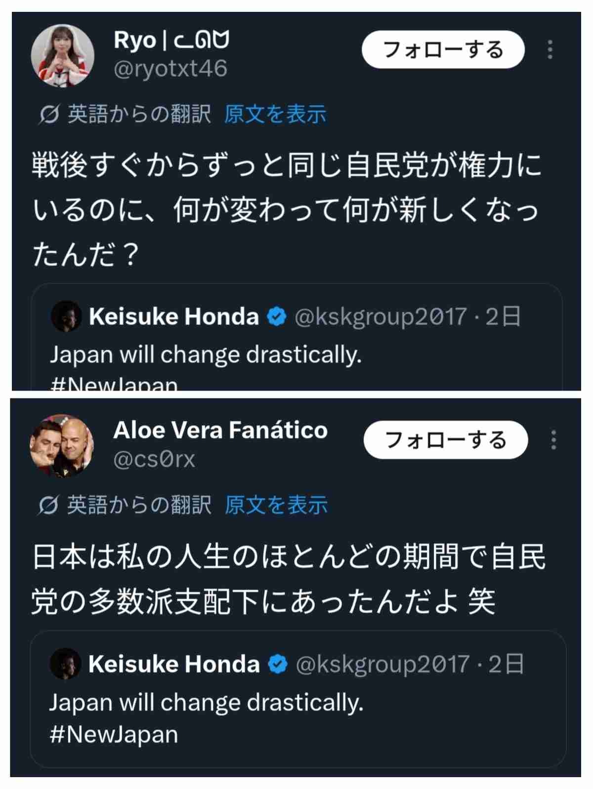 - 本田圭佑「Japan will change drastically(日本は劇的に変わる!」←自民党が圧勝した日に投稿