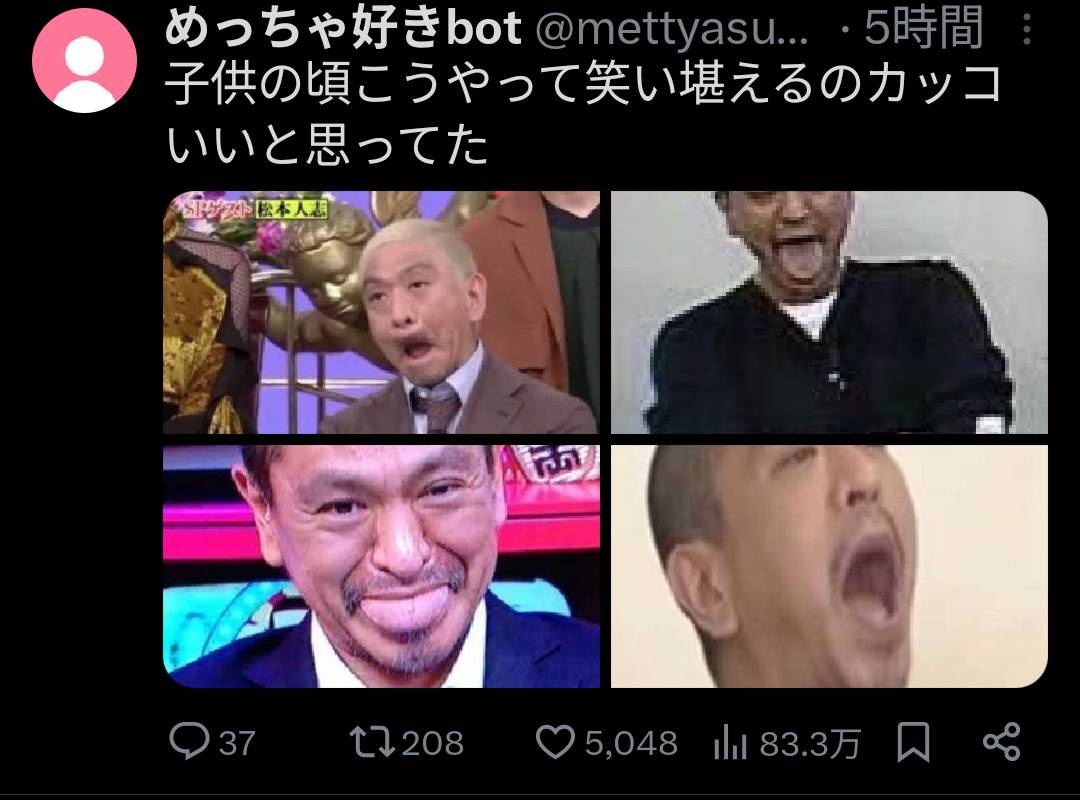 X民「松本人志みたいに口を大きく開けて笑いを我慢するの昔はカッコいいと思ってた」←83万いいねwww