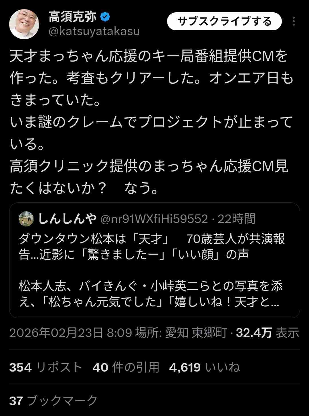 松本人志、CMすらも放送できない地上波完全禁止人物に認定されてる模様www