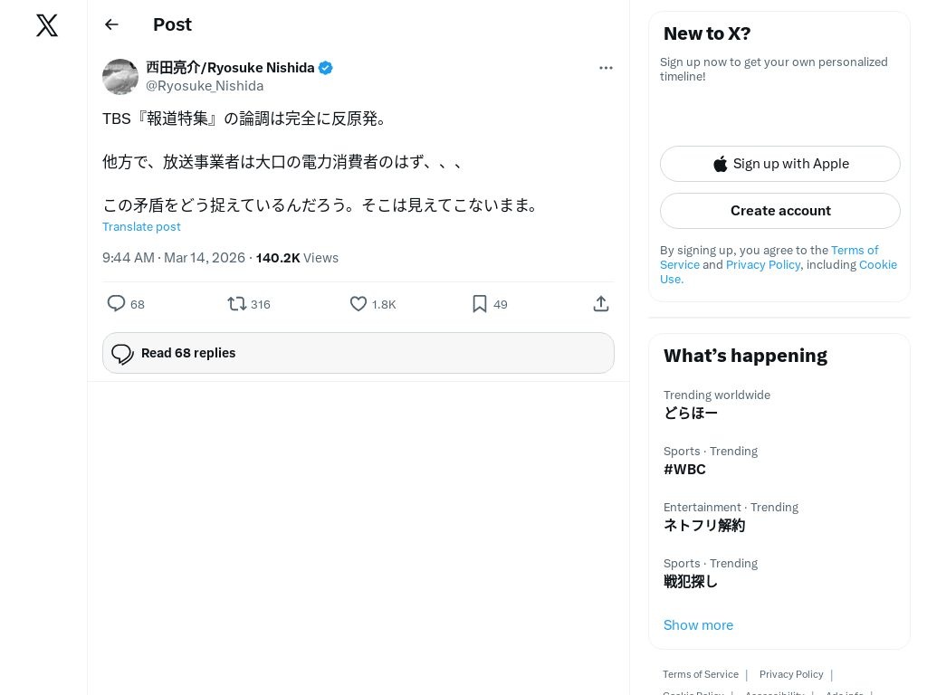 識者、報道特集の反原発にシュバる「TBSは大口電力消費者のくせに報道特集で完全に反原発。この矛盾どうすんのwww」