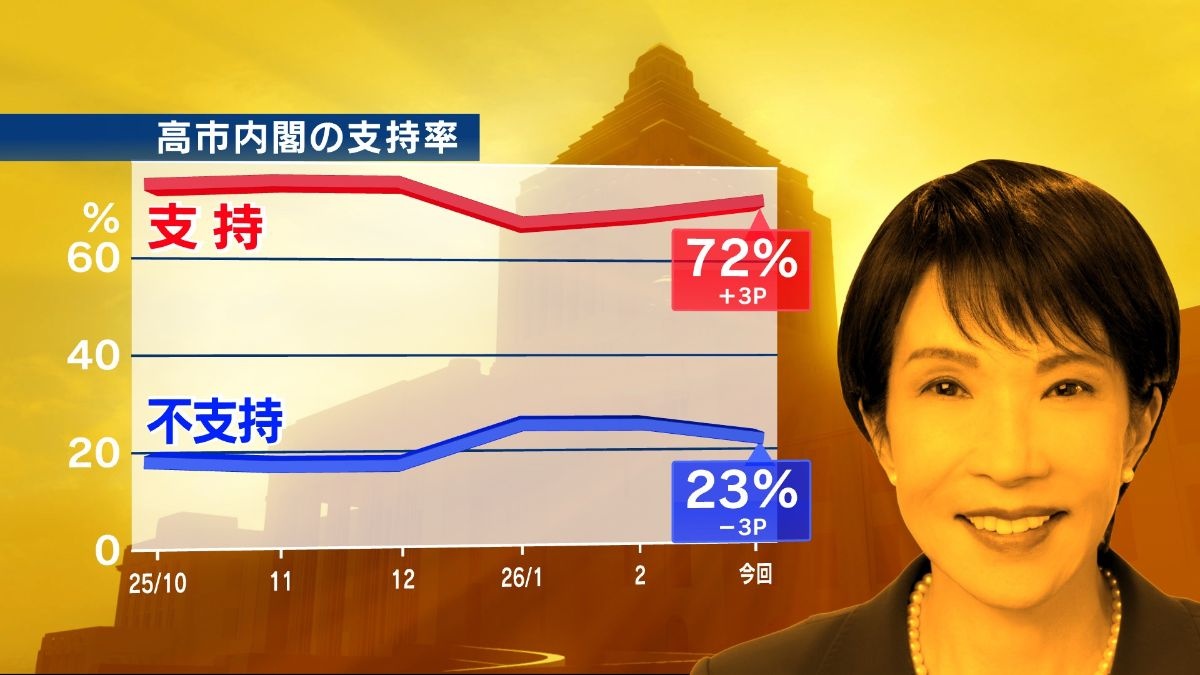 テレビ東京と日本経済新聞社が実施した3月の世論調査で、高市内閣を「支持する」と答えた人は72%でした。2月の調査から3ポイント上昇し3カ月ぶりに7割台に回復しました。内閣を「支持しない」と答えた人は先月から3ポイント低下し23%でした。