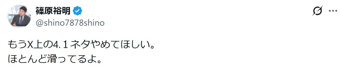 https://approach.yahoo.co.jp/r/QUyHCH?src=https%3A%2F%2Fnews.yahoo.co.jp%2Farticles%2Fd9c2c10a95a4bfd4de76f4d8e70641750c3d9849&preview=autoテレビ東京の元官邸キャップの名物記者、篠原裕明氏が1日、自身のX(旧ツイッター)を更新。エイプリルフールの投稿にやんわりと苦言を呈し、理由も説明した。