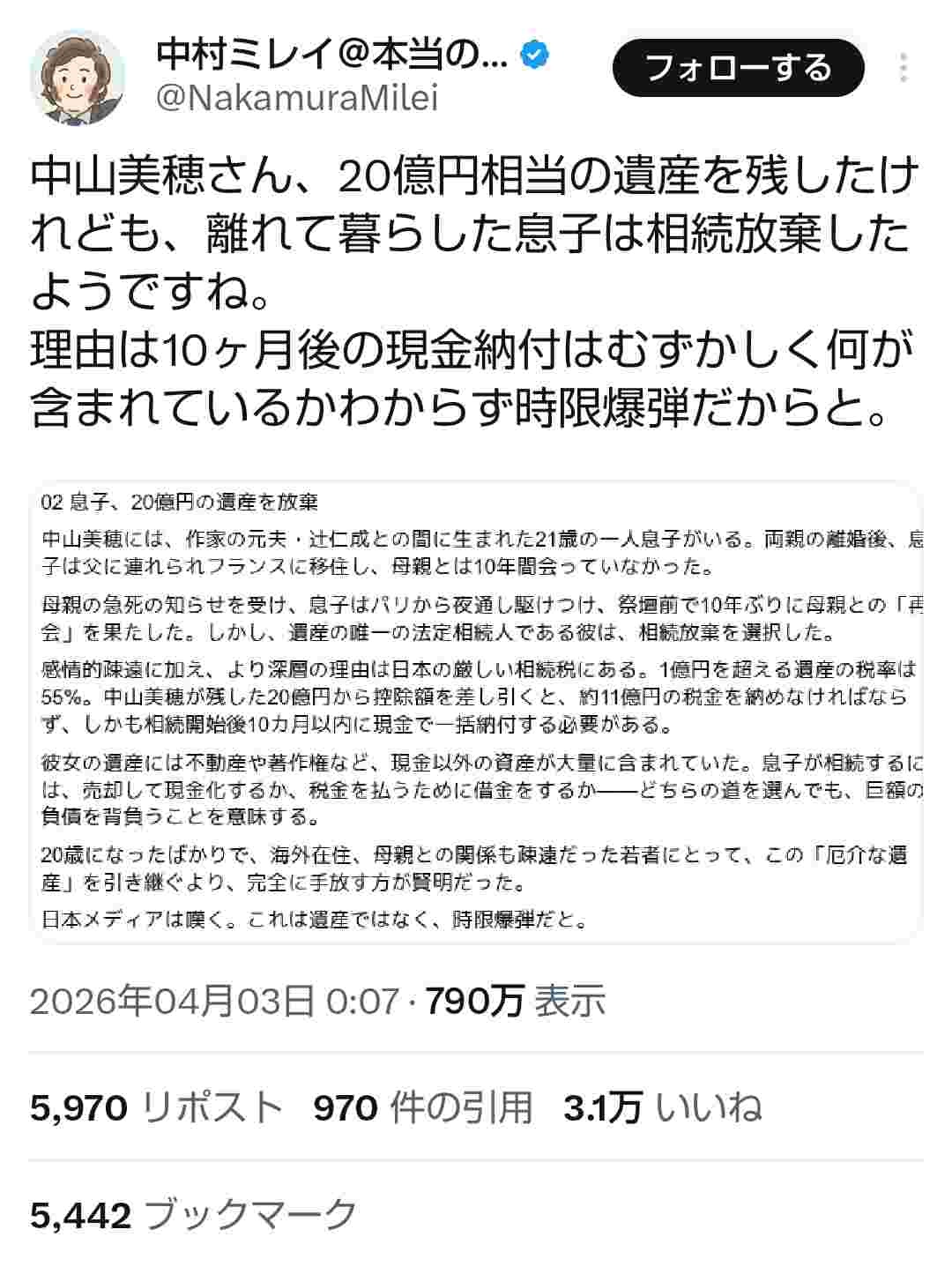 中山美穂の息子、美穂の遺産20億円を相続するも10ヶ月後に現金で11億円の相続税を納付しなければならず相続放棄