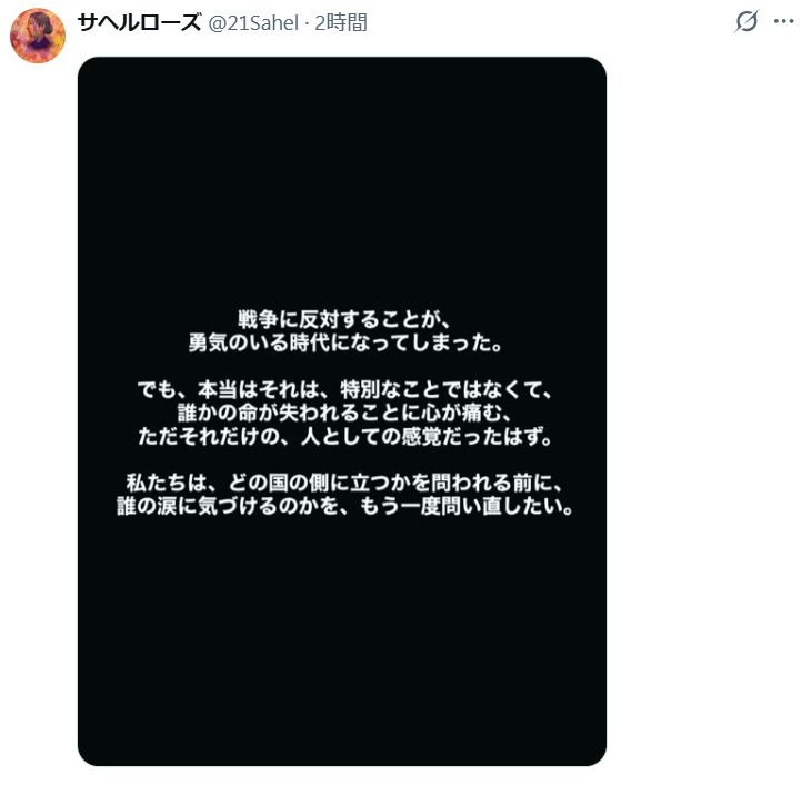 母国に対する米国とイスラエルの軍事攻撃が続く中、ローズは「私たちは、どの国の側に立つかを問われる前に、誰の涙に気づけるのかを、もう一度問い直したい」とつづった。