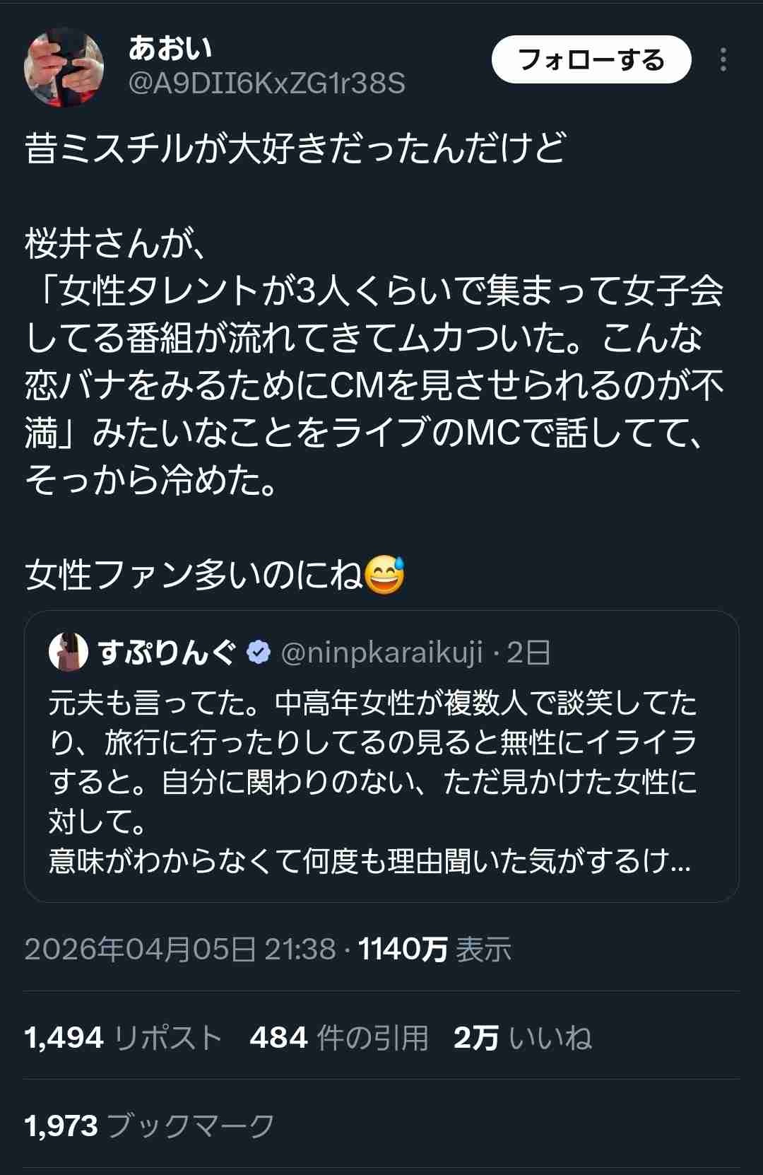 ミスチル桜井「女タレントが女子会してるみたいなテレビ番組がウザすぎる」👉炎上