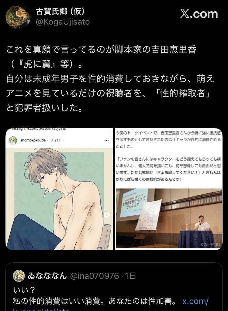 ぼざろのフェミニスト脚本家「私の性的消費はいい消費。あなたのは性加害。」→無事、炎上www