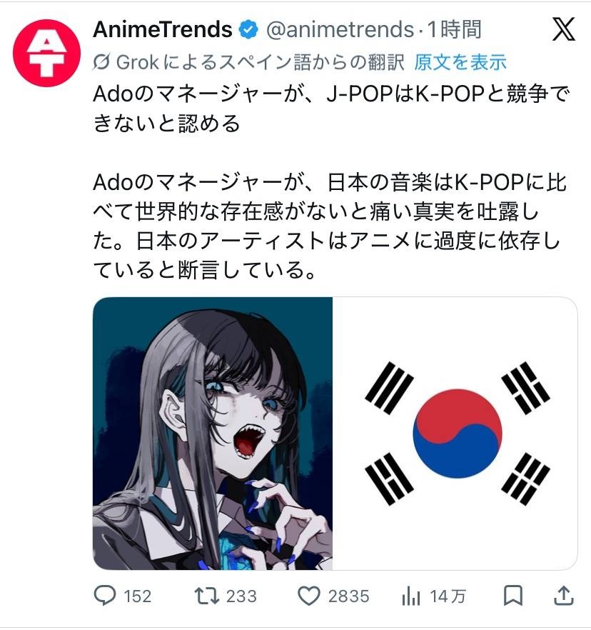 adoのマネージャー、J-POPを下げてK-POPを持ち上げ大炎上www