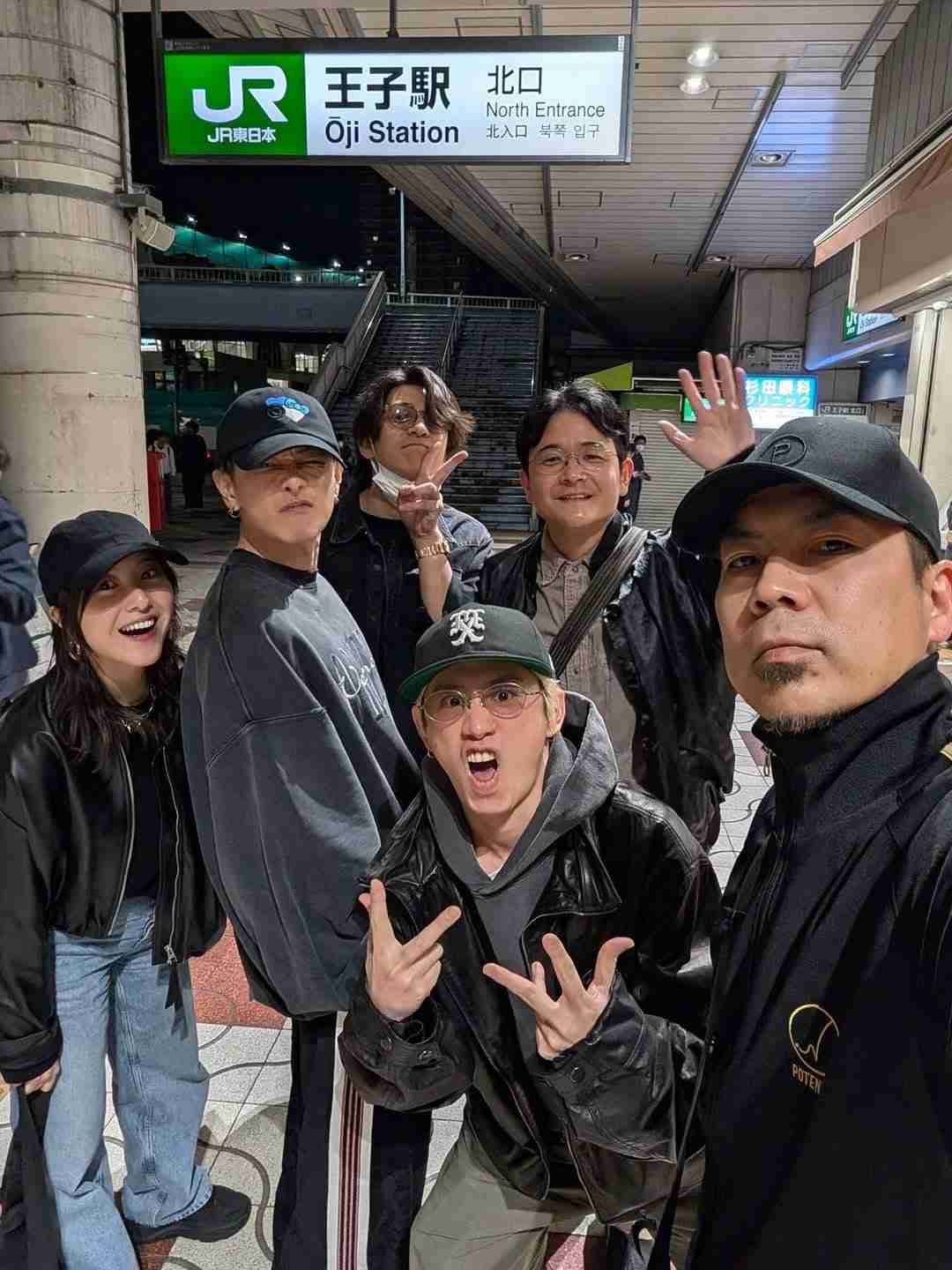 - JR王子駅の看板をバックにした自身とお笑いコンビ「千鳥」のノブ、ロックバンド「ONE OK ROCK」のTaka、俳優の佐藤健、三浦翔平、女優の吉高由里子の集合ショットをアップした。