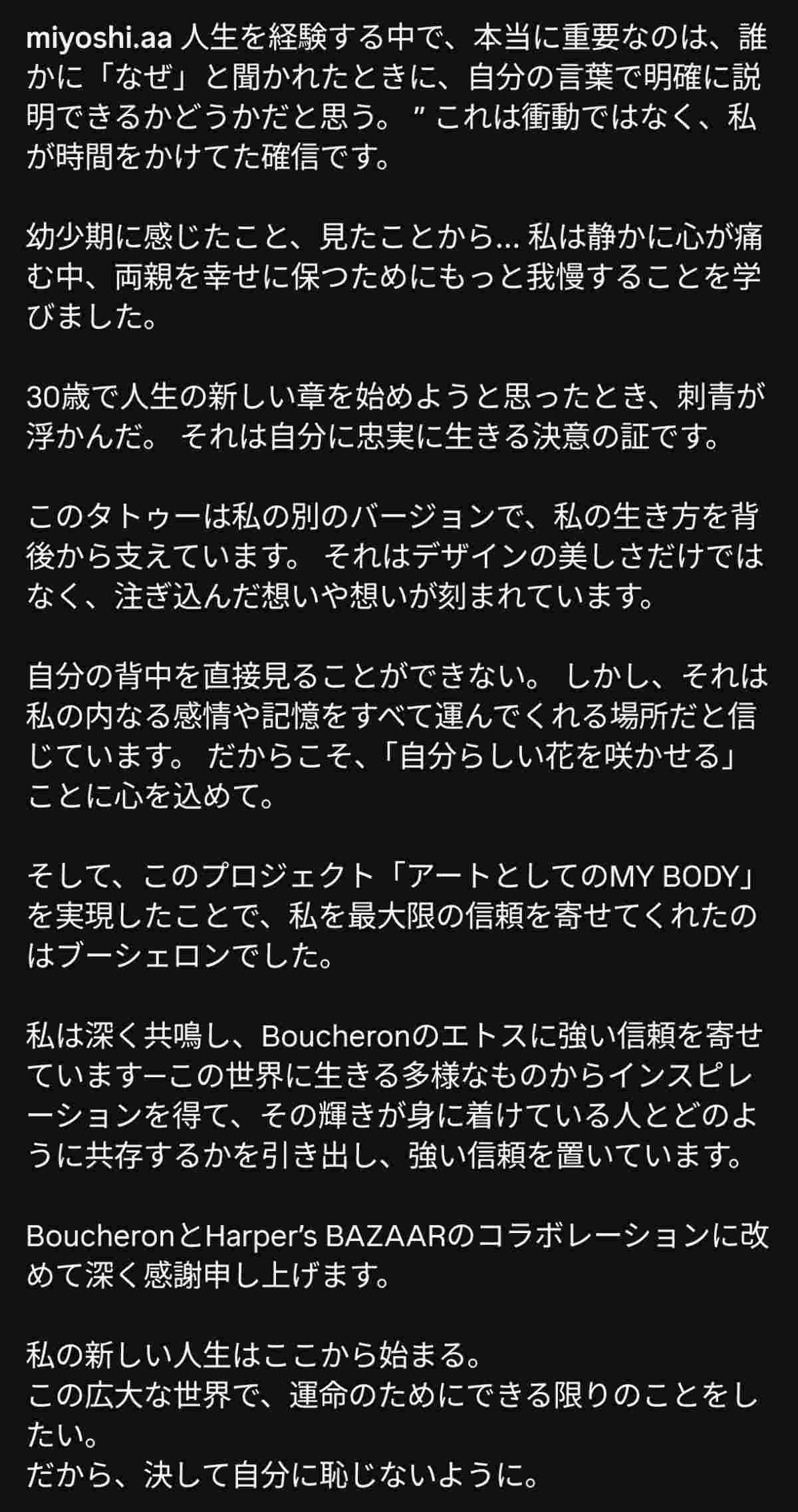 30歳を前にして大胆なタトゥーを入れた三吉。インスタグラムでは《私の新しい人生はここから始まる。この広大な世界で、運命のためにできる限りのことをしたい。だから、決して自分に恥じないように》(※原文は英語)と、強い意思を語っている——。