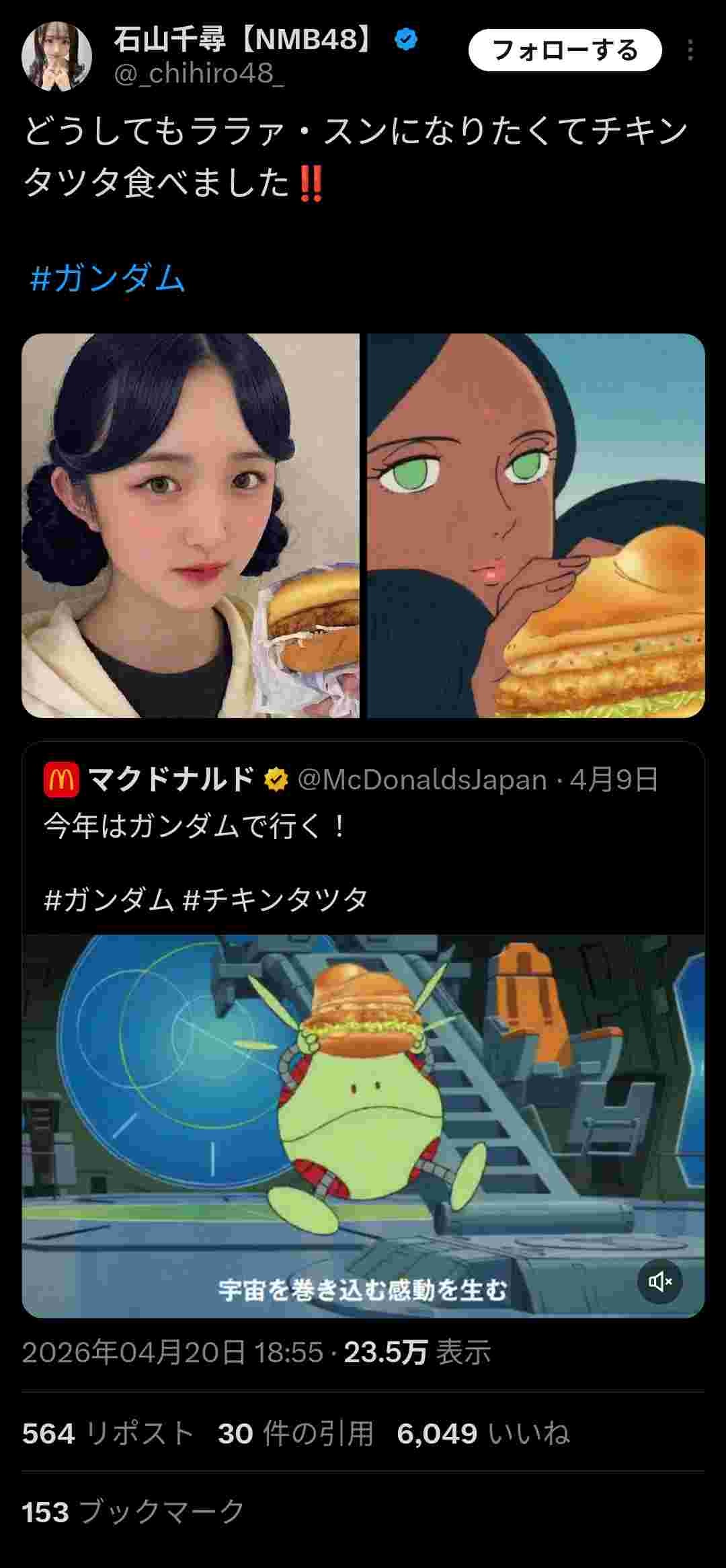 『ガンダム』ララァ激似!人気アイドルに大反響 チキンタツタ食べて「そっくり」「センス良すぎ」
