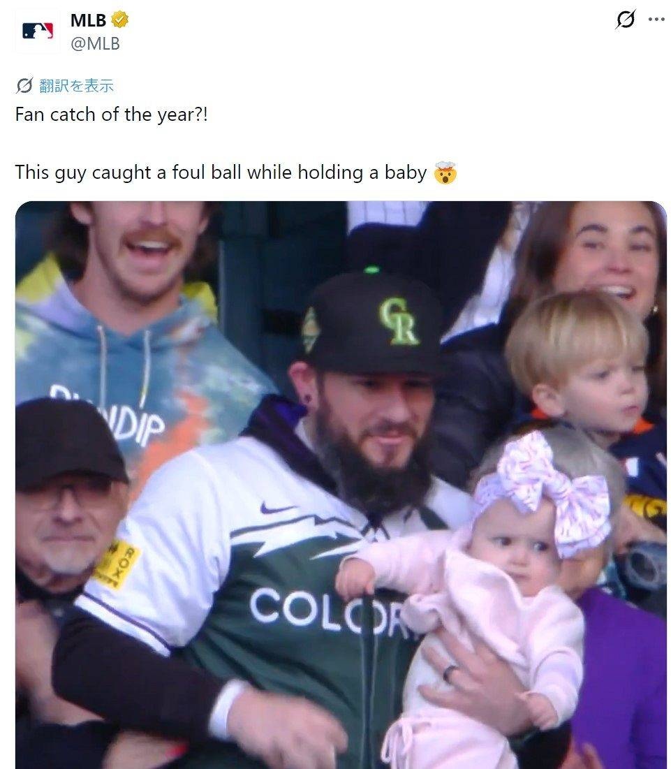 注目されたのは、乳児を抱えたままファウルボールを右手で捕球した男性ファン。ロッキーズのレプリカユニホーム姿で、周囲にはドジャースのキャップをかぶったファンもいる。スタジアム上部の塀にぶつかったボールが跳ね返り、そのファンの元へ飛んだ。MLB公式Xでは「ファン・キャッチ・オブ・ザ・イヤー? 男性が赤ちゃんを抱きかかえたままファウルボールをキャッチした」とコミカルに紹介された。