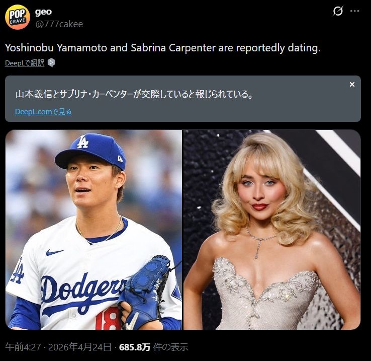 - 山本義信とサブリナ・カーペンターが交際していると米メディアが報道