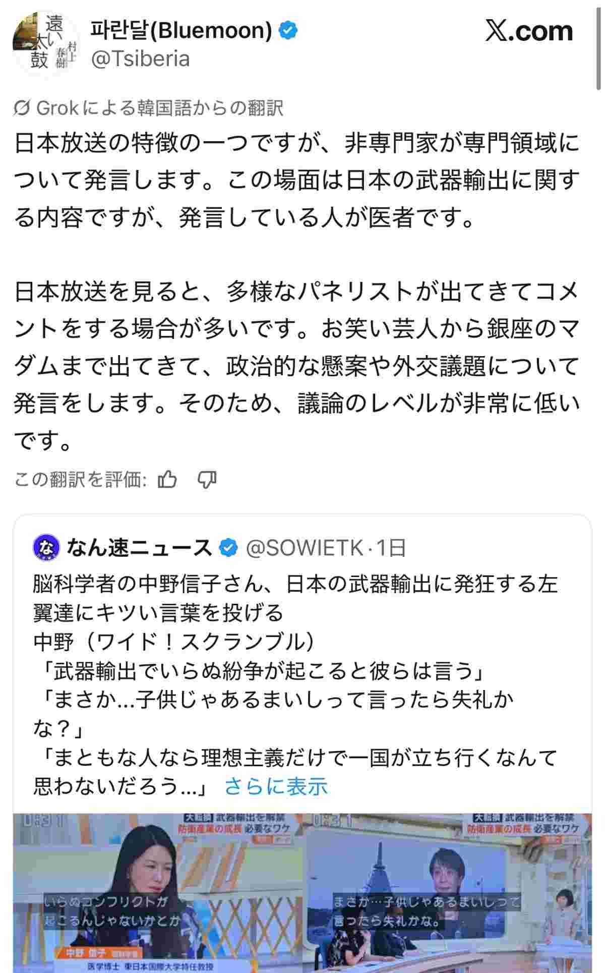韓国人「日本のテレビは議論のレベルが非常に低いのが特徴です。お笑い芸人や銀座のマダムが専門領域についてコメントしています」