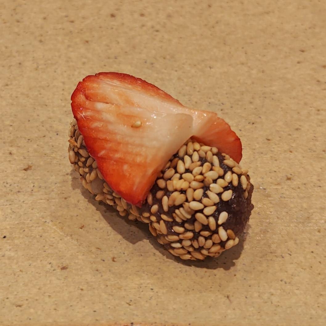 コースの最初がナス のにぎりで、最後がイチゴ とあんこのにぎり