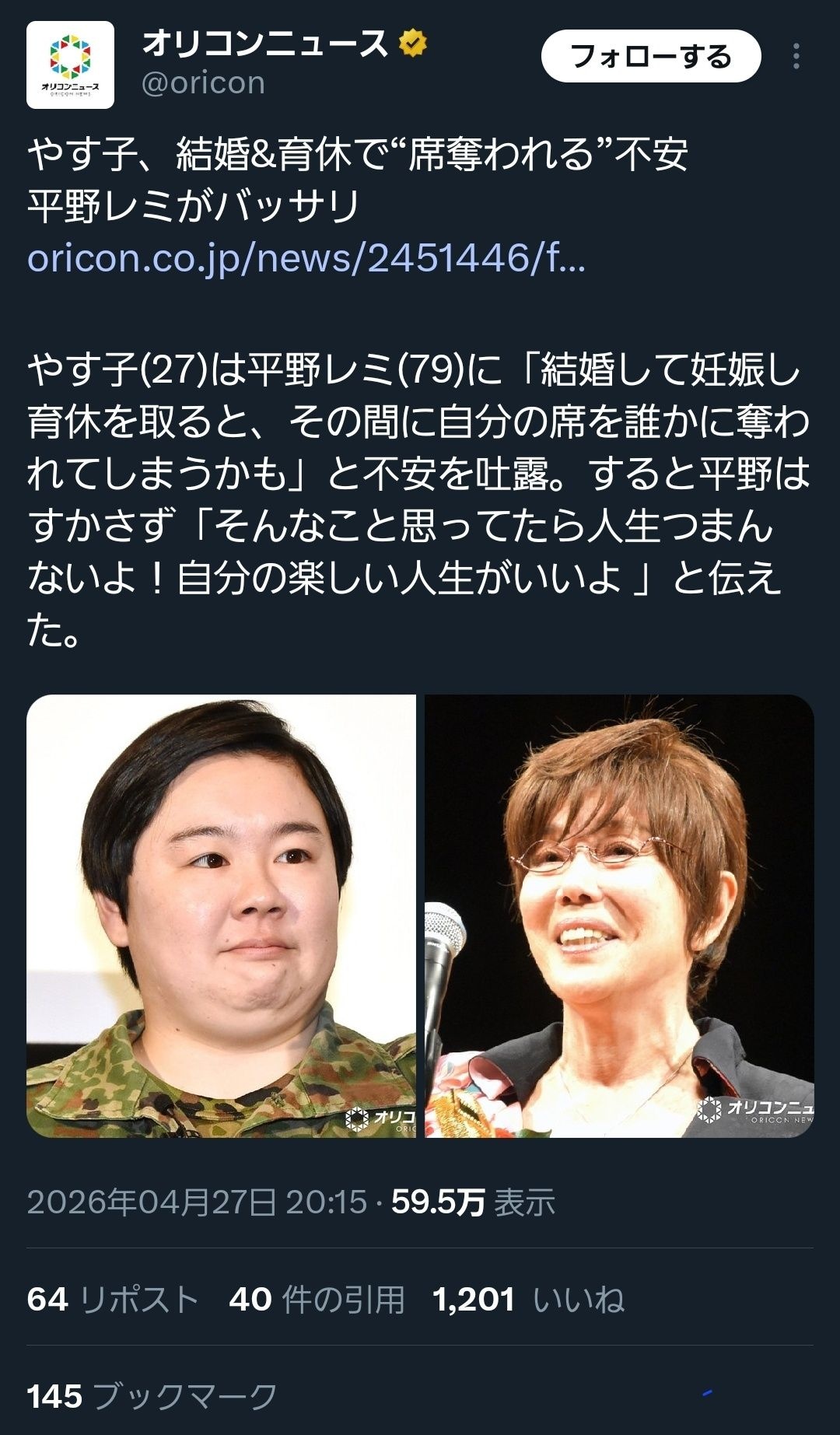 やす子「わたしが妊娠出産してる間に芸能界の席を奪われそうで不安」10万いいね