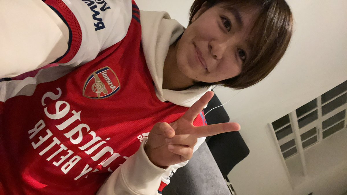ピースサインで登場した岩渕。白のパーカーにアーセナルのユニフォームを合わせたコーデ姿を披露。クラブカラーにマッチした衣服でポーズを決めつつ、ファンにメッセージを送っている。