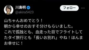 エッヂ 麒麟川島「山里亮太が結婚かぁ、お祝いツイートするか」