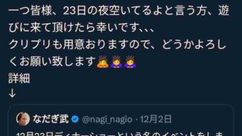 エッヂ なだぎ武、クリスマスディナーショーの予約を満杯にする エッヂ民敗北へ