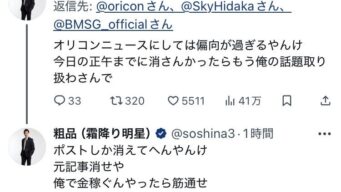 エッヂ 粗品「おいオリコンゴラァ!偏向報道すんじゃねえ!!!」オリコン「ヒッヒェ~すみません😭すぐ記事消しますから😭」