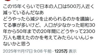 芸スポ 『この15年で日本の人口は500万人減』 武井壮「減少よりも増えた理由考えてみたら」人口減巡る私見ポスト SNSで大激論
